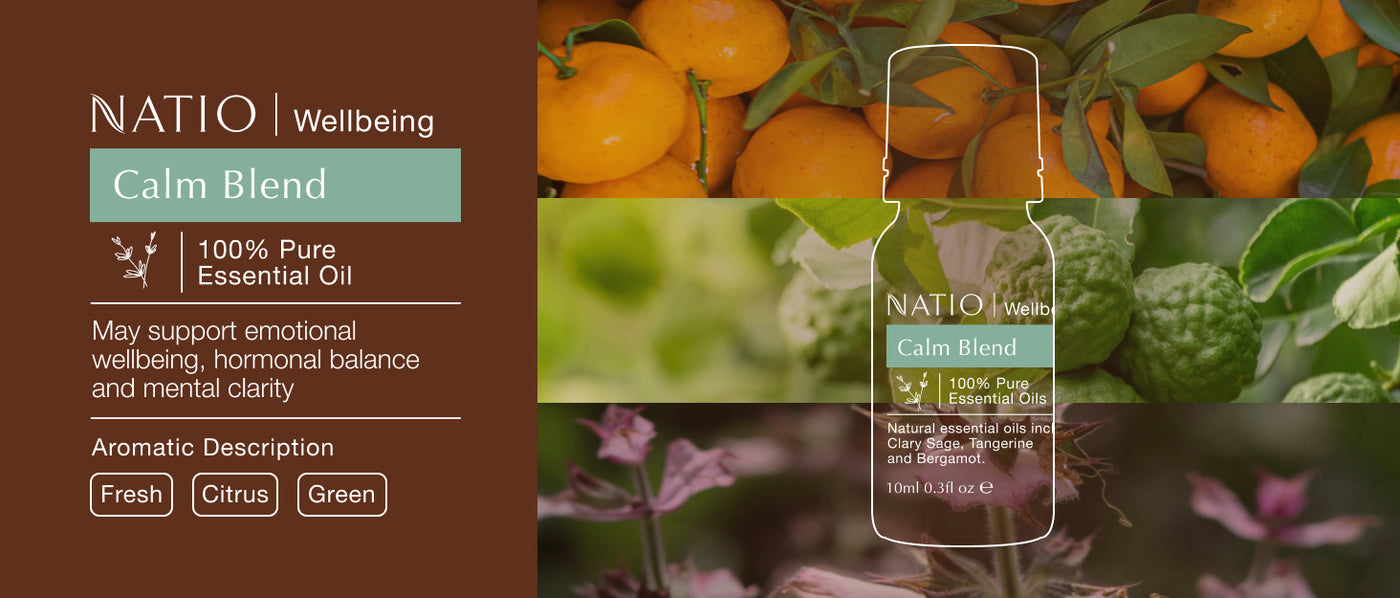 Restore your emotional balance with this deeply relaxing Pure Essential Oil Blend featuring 100% pure and natural essential oils often used to help calm the nerves and bring peace of mind. Featuring an expertly curated selection of oils including Clary Sage, Mandarin and Bergamot, Calm provides a synergistic essential oil mix, crafted to help provide immediate comfort. Part of Natio's Wellbeing Pure Essential Oils range; made with pure natural essential oils from around the world, bottled in Australia.