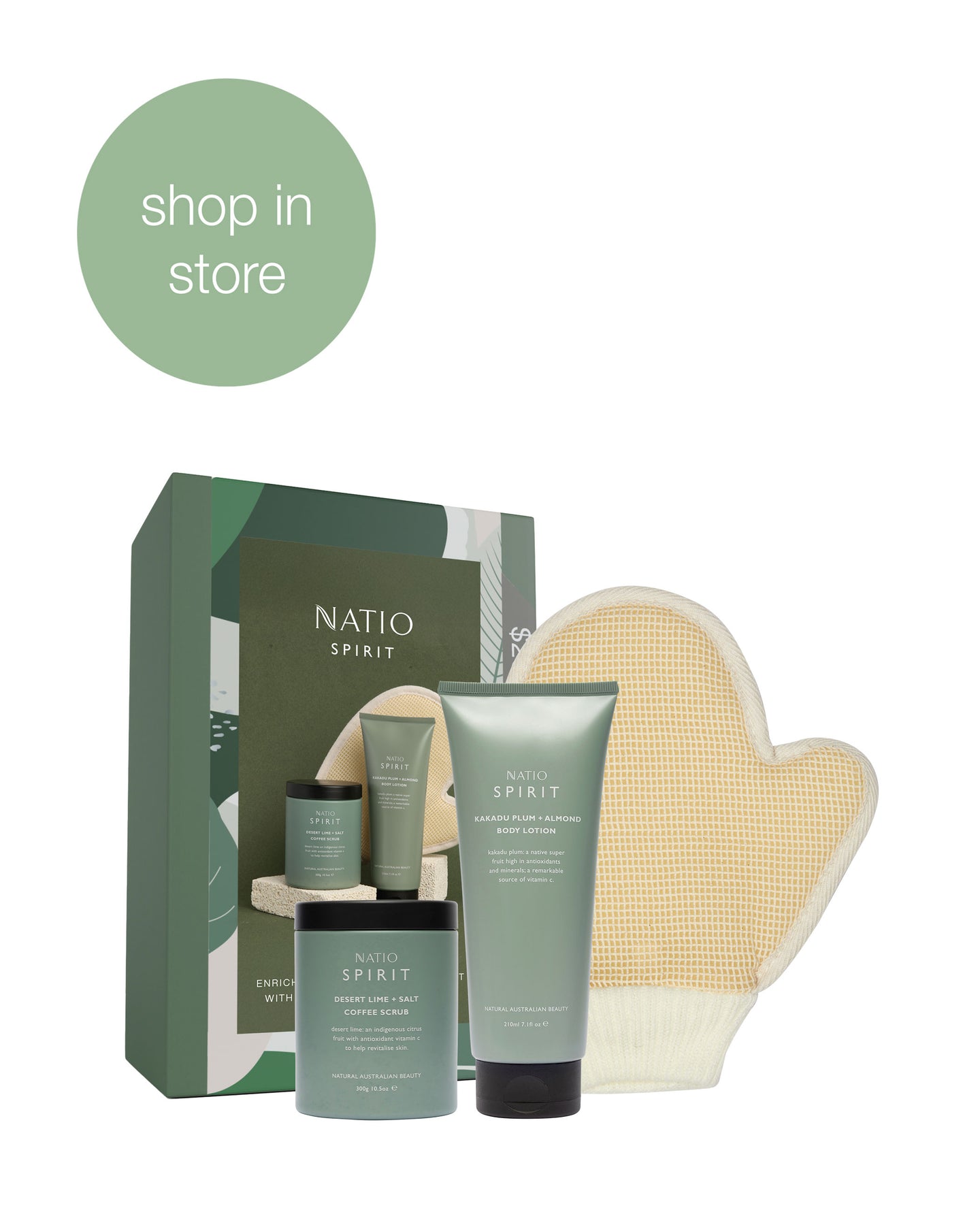 A gift of native Australian botanical nourishment and silky smooth, rejuvenated skin. 'Haven' gift set contains a full size Spirit Desert Lime + Salt Coffee Scrub and Kakadu Plum + Almond Body Lotion plus complimentary bath glove, presented in a Natio gift box.
