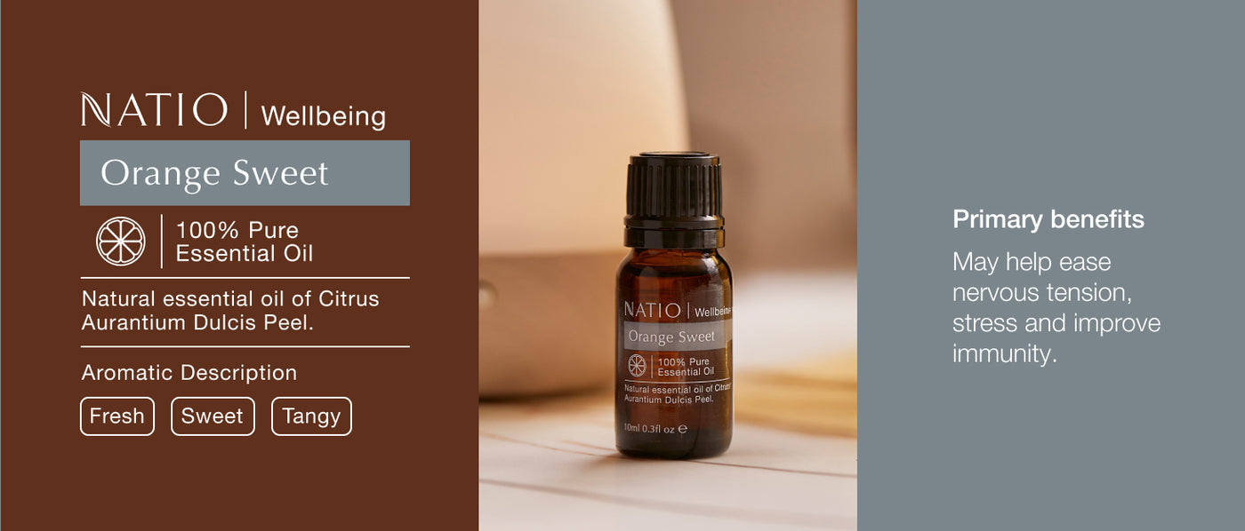 Put a spring in your step with the warm, cheerful scent of Sweet Orange. Gently extracted from the aromatic peel of Sweet Oranges and 100% pure and natural, Orange Sweet Essential Oil is often used to help warm and energise the spirit and soul. Part of Natio's Wellbeing Pure Essential Oils range; made with pure natural essential oils from around the world, bottled in Australia.