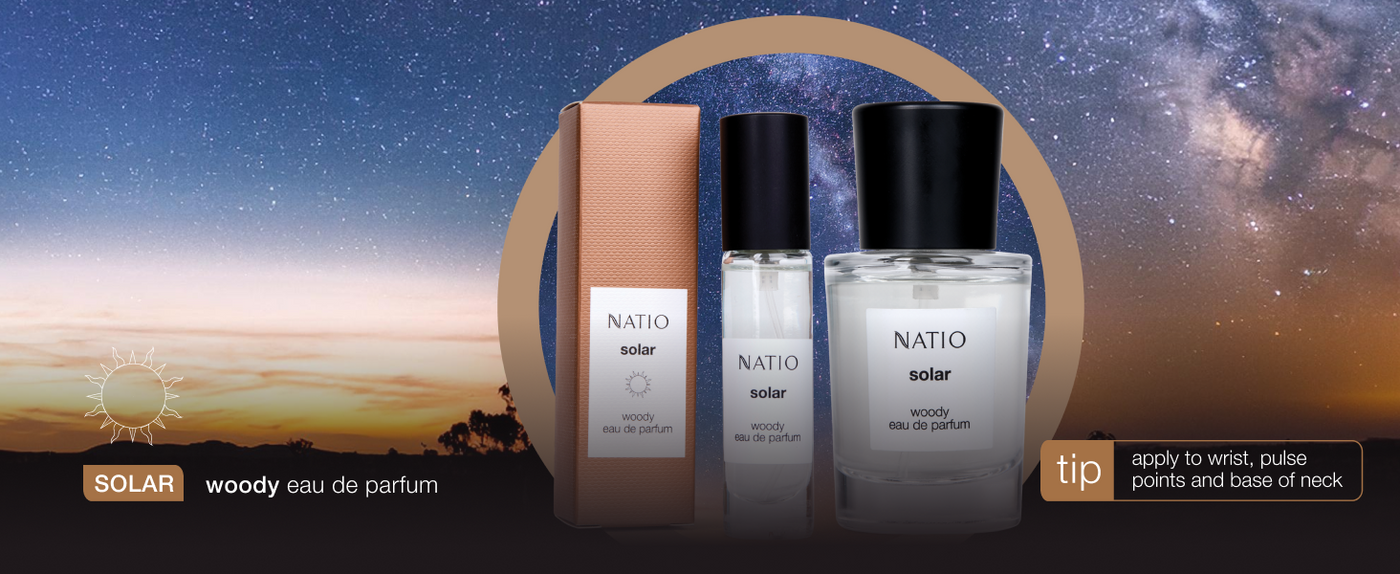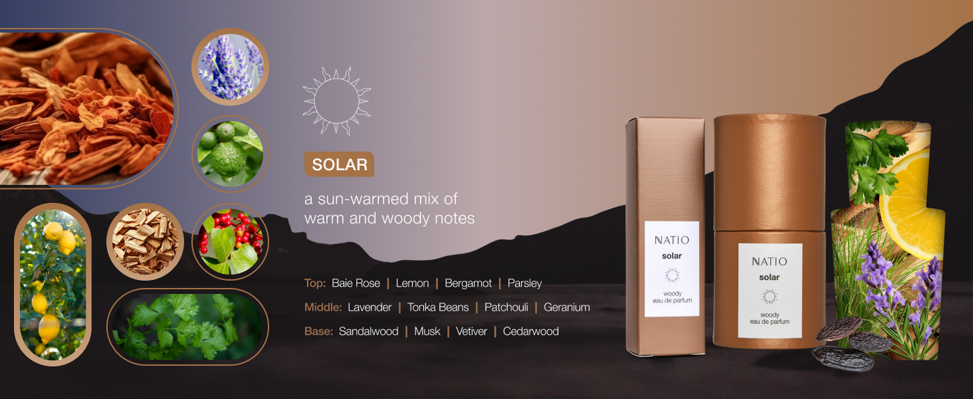 Like the burnished glow of a golden southern sky, radiant Solar beams with rich warmth and honeyed luminosity. In composition, aromatic top notes of sun-kissed Baie Rose, Lemon, Bergamot and Parsley melt into a glowing heart of Lavender, Tonka Bean, Patchouli and Geranium, gently drying down into a cosy embrace of Vetiver, Musk, Sandalwood and Cedarwood. A charismatic spiced woods eau de parfum, confident and warm.