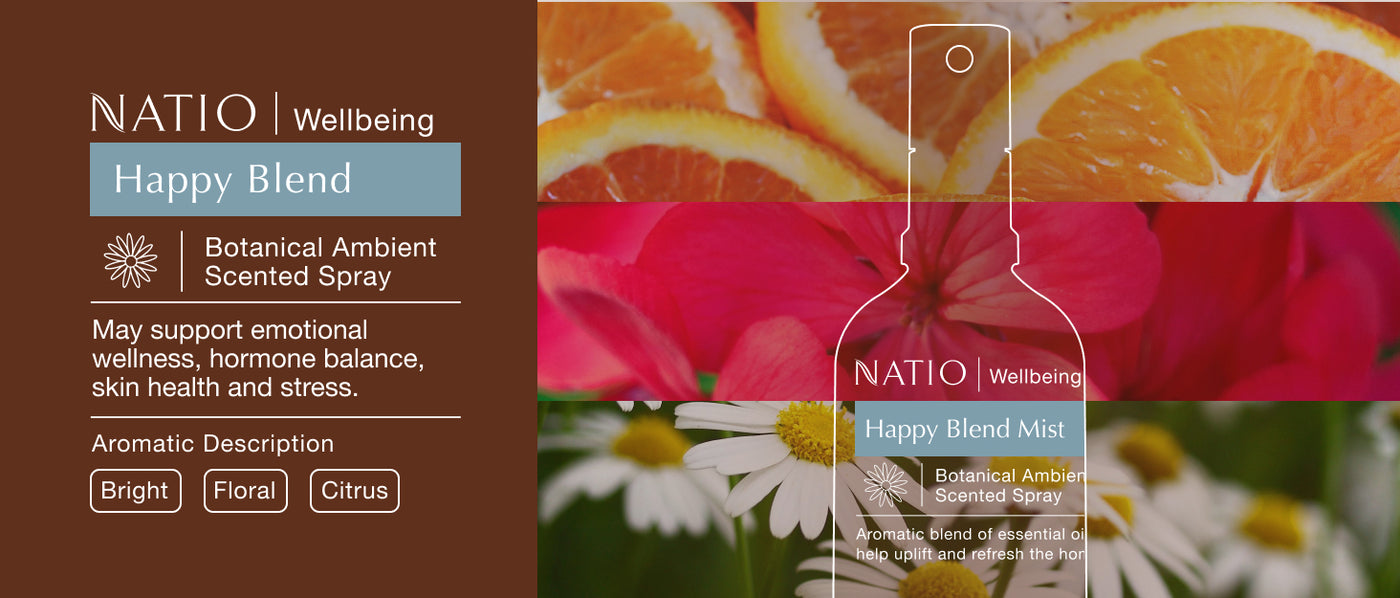 Summon the mood-elevating benefits of pure plant aromatics with a simple spritz. A luxurious aromatic spray, this uplifting mist with botanical extracts of cheery Geranium and Orange, calming Lavender and Chamomile and warm Ylang Ylang helps to promote an atmosphere of sunny optimism. Part of Natio's Wellbeing range of botanical ambient scented sprays formulated with pure natural essential oils. Made in Australia.