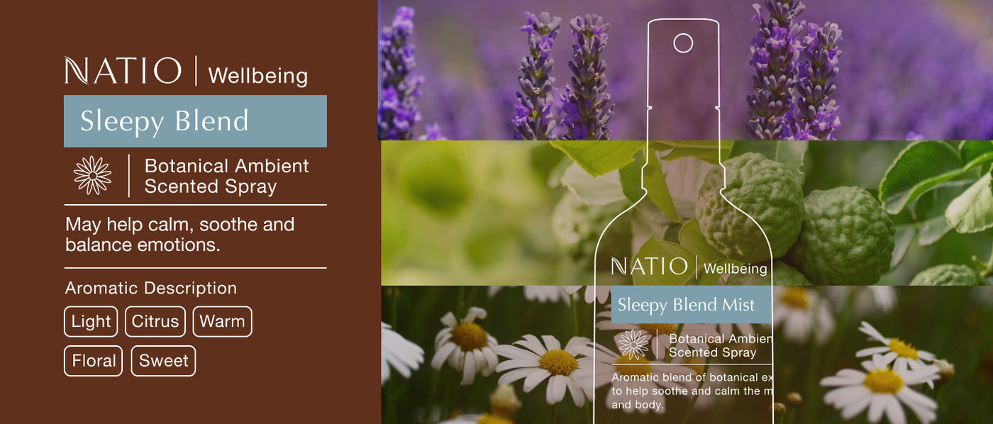 Summon the mood-elevating benefits of pure plant aromatics with a simple spritz. A luxurious aromatic spray, this soothing mist with botanical extracts of Lavender and Valerian helps to promote an atmosphere of calm and tranquility, conducive to good sleep. Part of Natio's Wellbeing range of botanical ambient scented sprays formulated with pure natural essential oils. Made in Australia.