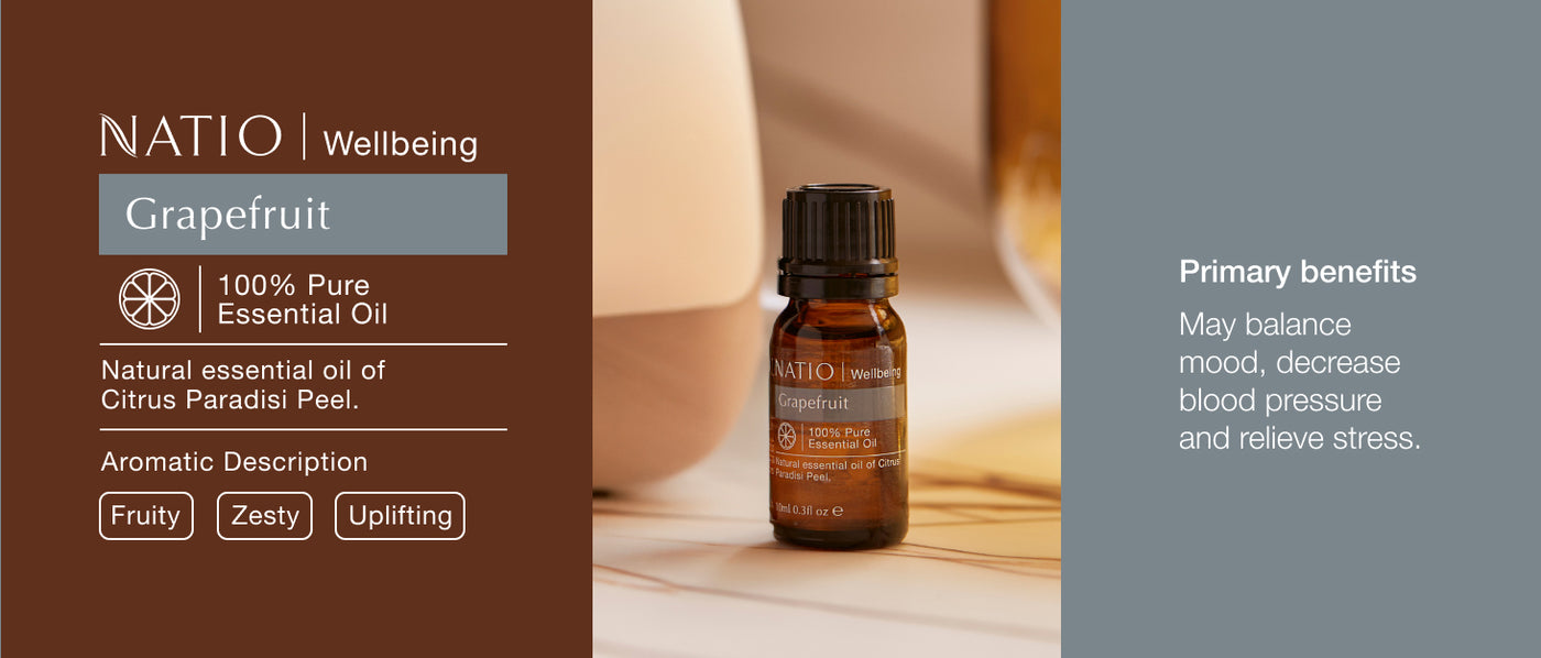 Breathe deep and experience an energising and invigorating aroma. Gently extracted from the peel of the Grapefruit and 100% pure and natural, Grapefruit Essential Oil is often used to uplift the spirit and brighten the mood. Part of Natio's Wellbeing Pure Essential Oils range; made with pure natural essential oils from around the world, bottled in Australia.