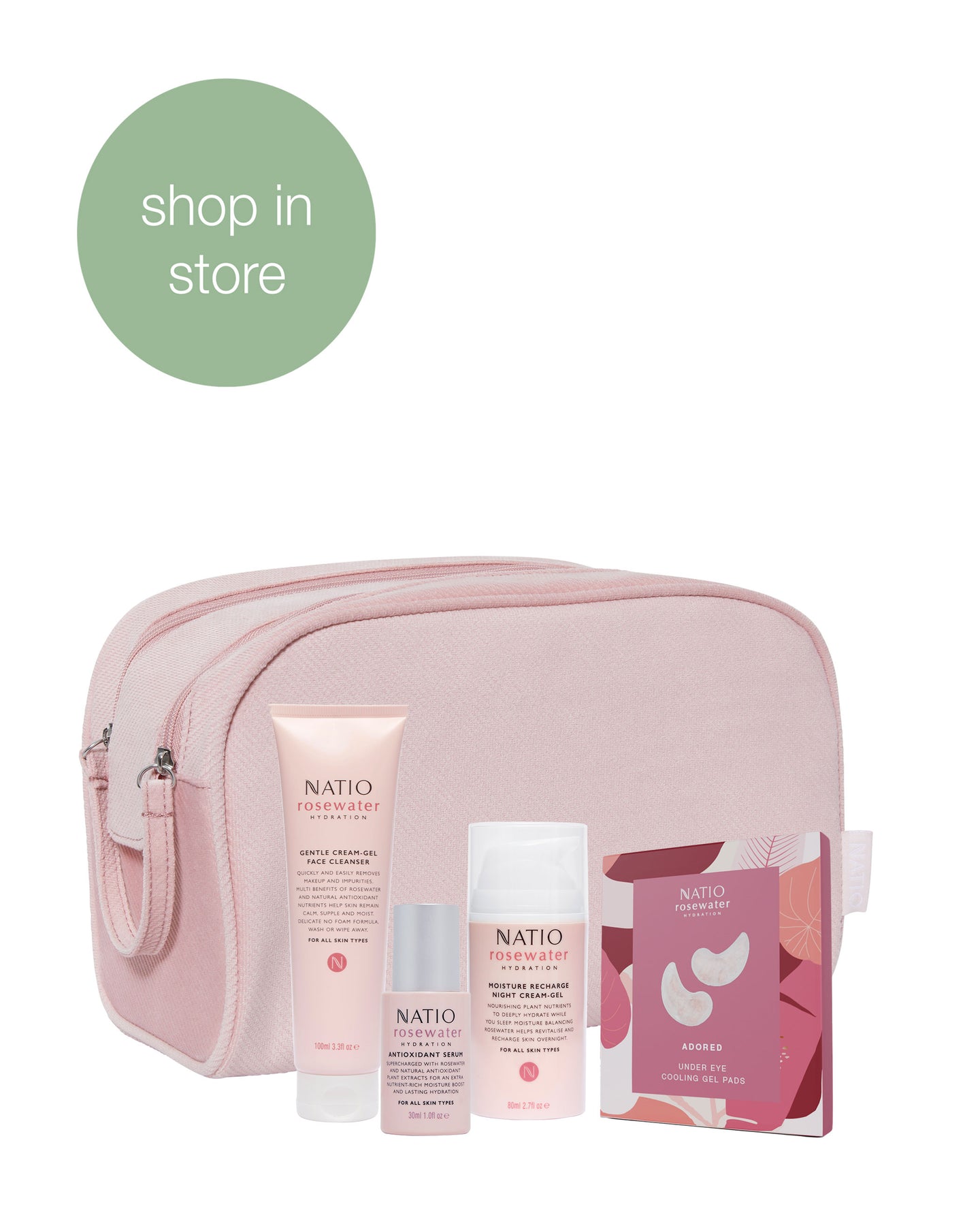 Beautifully balanced hydration for petal soft, supple skin. Richly replenishing skincare, crafted with heavenly hydrating Rosewater. Luxuriously aromatic and deeply pampering, Rosewater softens and plumps the skin and soothes the senses for a moment of daily self-care. Gift set includes a Rosewater Hydration Gentle Cream-Gel Face Cleanser, Antioxidant Serum, Moisture Recharge Night Cream-Gel and Natio under eye gel pads, presented in a premium Natio cosmetic bag.