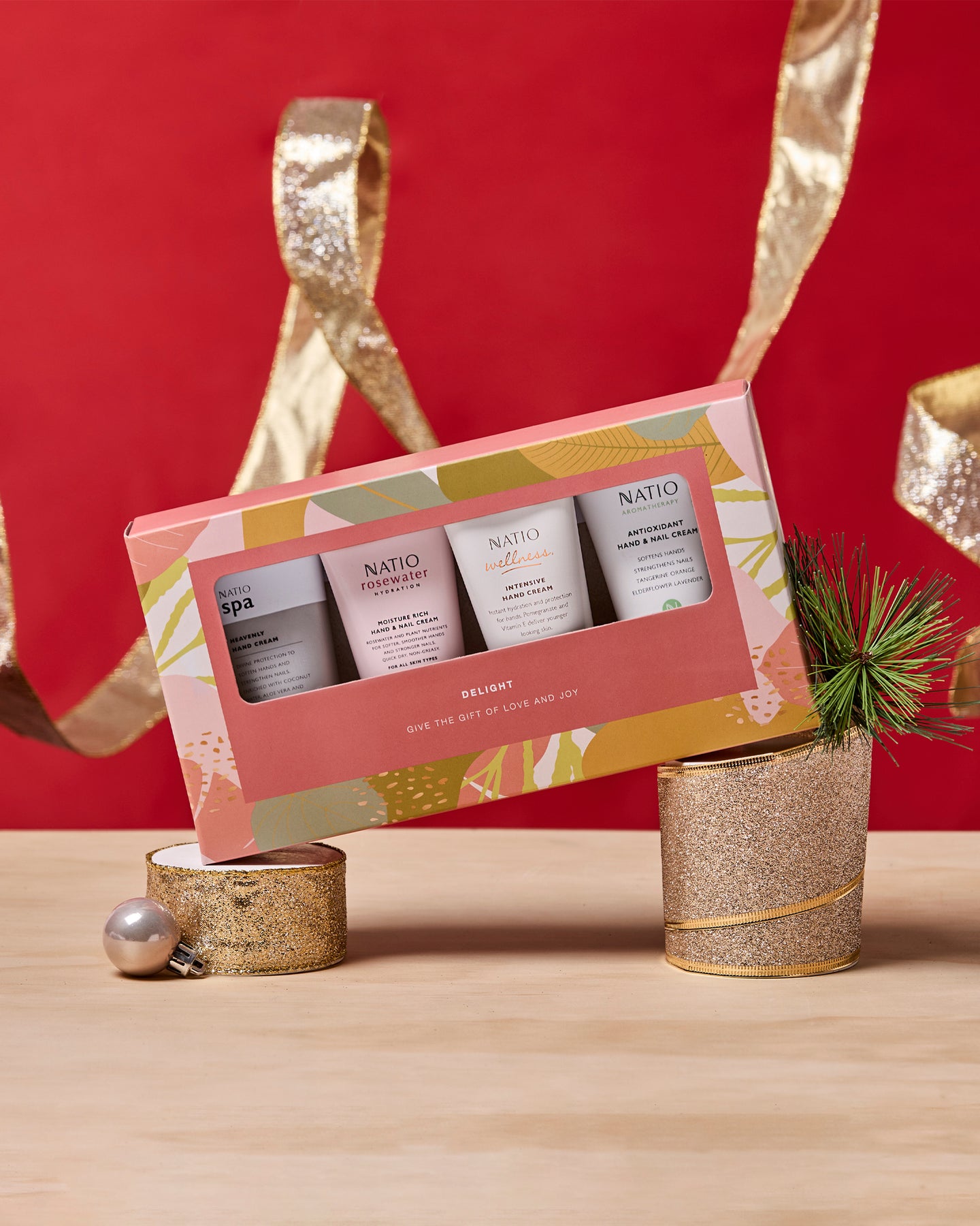 Lovers of little luxuries will adore this travel-sized quartet of naturally nourishing and aromatic hand creams. 'Delight' includes a travel-sized Spa Heavenly Hand Cream 50ml, wellness Intensive Hand Cream 50ml, Rosewater Hydration Moisture Rich Hand & Nail Cream 50ml and Aromatherapy Antioxidant Hand & Nail Cream 50g, ready to gift in a Natio presentation box.