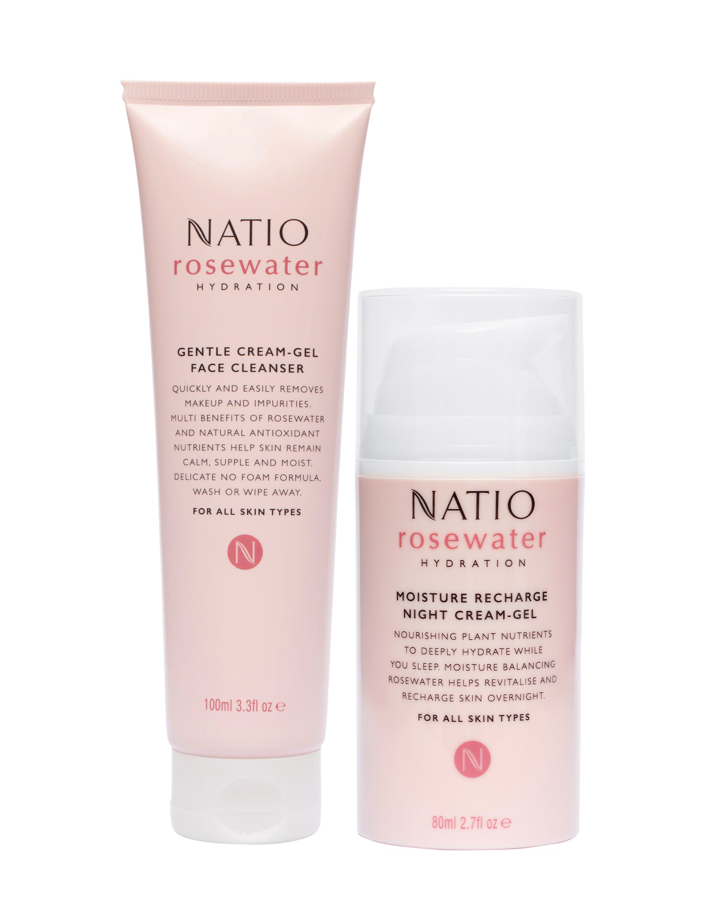 Elevate her evening regimen with silky soft and sweetly aromatic Rosewater skincare formulations. 'Cherished' gift set contains a full size Rosewater Hydration Gentle Cream-Gel Face Cleanser and Moisture Recharge Night Cream-Gel plus complimentary Natio satin heatless hair curling set, presented in a Natio gift box.